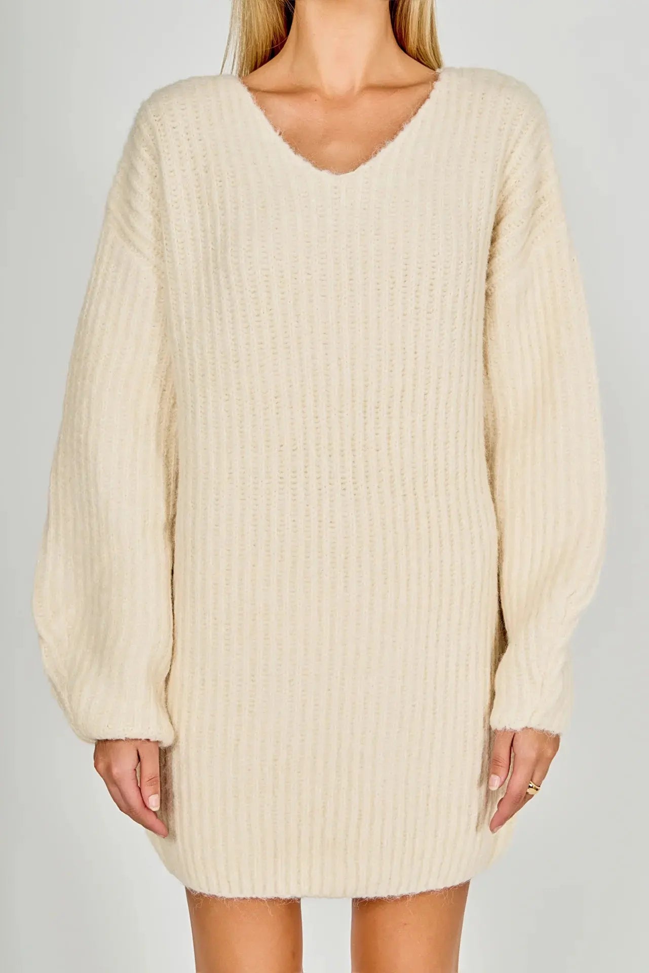 Stay cozy and stylish in our Chunky Rib Oversized Mini Dress. Made from a soft, hairy knit fabric, this dress features a flattering V neckline and trendy ribbed details. Perfect for any occasion, dress it up with heels or dress it down with sneakers. The oversized fit allows for ultimate comfort and a chic, relaxed look. Don't miss out on this must-have addition to your wardrobe. Shop now and experience the ultimate blend of comfort and style.